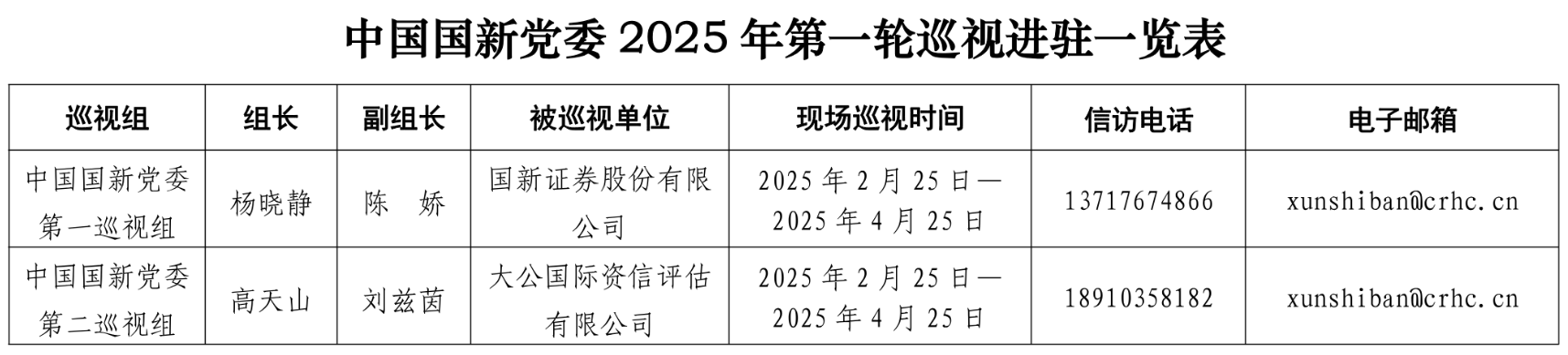 按照中國國新黨委和巡視工作領導小組部署,2月25日,中國國新黨委2個巡視組分別進駐國新證券股份有限公司(以下簡稱國新證券)、大公國際資信評估有限公司(以下簡稱大公國際)。2家被巡視企業分別召開巡視進駐動員會,中國國新黨委2025年第一輪巡視全面展開。中國國新黨委巡視組組長作動員講話,對學習貫徹習近平總書記重要指示批示精神,貫徹落實黨中央、國務院國資委黨委關于巡視工作部署要求,扎實開展本次巡視提出工作要求。