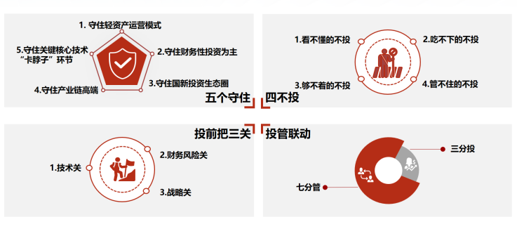 著力強化全面風險管理。按照風險“可控、在控、能控”的總體要求,建立責任明確的全面風險管理體系,完善總法律顧問、首席風險官、首席合規官制度,設立獨立的風險、合規部門,配備專業的合規風控團隊。設計并實行“前中臺部門平行作業”“中介機構用聘分離”“項目投資偏離度考核”等多項機制,確保中臺職能部門重大項目全程參與,構建交叉驗證的支撐體系,確保各項風險管控措施落地。