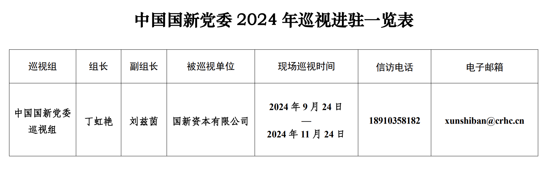 巡視期間,巡視組設有專門值班電話、電子郵箱,受理反映國新資本領導班子及其成員、下一級主要負責人和重要崗位領導干部問題的來信來電來訪。巡視組受理信訪時間截止到2024年11月24日。