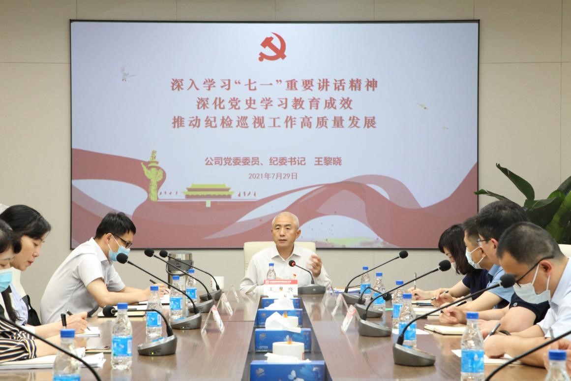 7月29日下午,公司黨委委員、紀委書記王黎曉同志為全體紀檢巡視干部講授專題黨課,深入學習領會習近平總書記在慶祝中國共產黨成立100周年大會上的重要講話精神,進一步做到學史明理、增信、崇德、力行,不斷增強“四個意識”、堅定“四個自信”、做到“兩個維護”,牢記“國之大者”,推動新時代紀檢巡視工作高質量發展。