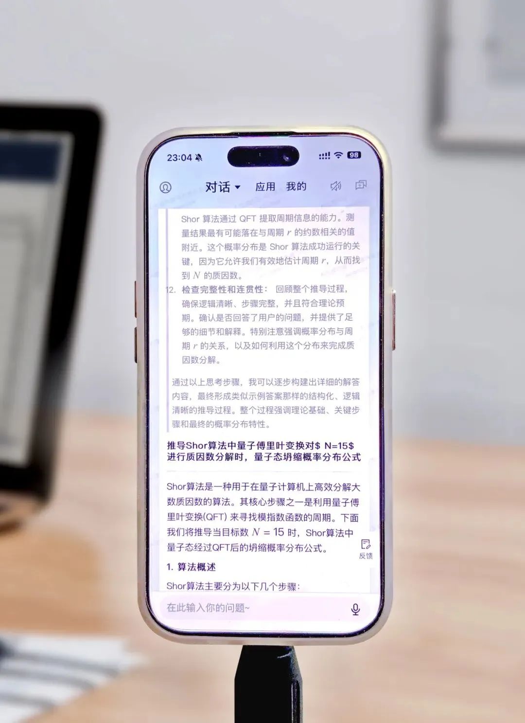 “九天”在推導Shor算法進行質因數分解時,量子傅立葉變換后的量子態坍縮概率分布公式,模型基于周期性態和量子傅立葉變換的數學性質計算測量結果的概率