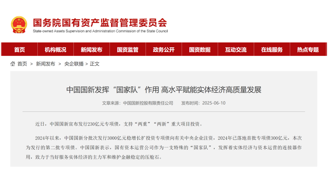 6月10日,國務(wù)院國資委網(wǎng)站發(fā)布《中國國新發(fā)揮“國家隊”作用 高水平賦能實體經(jīng)濟高質(zhì)量發(fā)展》,從“加大增量股權(quán)投資,塑造新興產(chǎn)業(yè)新動能”“強化增量資金供給,打造產(chǎn)融結(jié)合生態(tài)圈”“突出價值管理,服務(wù)國有資本效率效益提升”3個方面,報道中國國新作為一支特殊的“國家隊”,發(fā)揮著實體經(jīng)濟與資本運營的連接器作用,致力于當(dāng)好服務(wù)實體經(jīng)濟的主力軍和維護金融穩(wěn)定的壓艙石。現(xiàn)將全文分享如下: