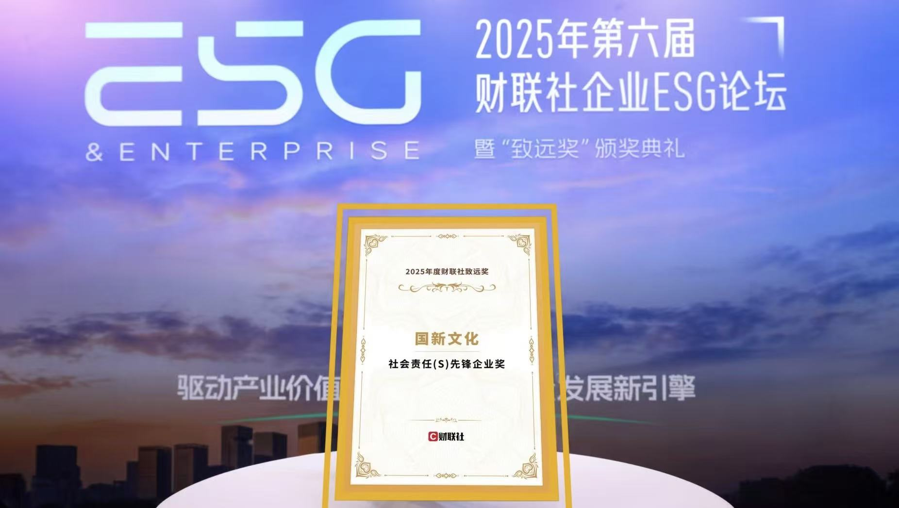 10月31日,2025年第六屆財聯社企業ESG論壇暨“致遠獎”頒獎典禮在北京舉行。國新文化獲財聯社致遠獎“社會責任先鋒企業獎”。