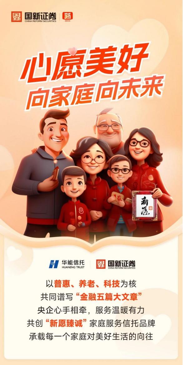 作為金融“五篇大文章”的積極踐行者,國新證券在“國新財富 貼心陪伴Everyday”財富管理品牌下設立“新愿”子品牌,并與華能信托攜手,充分融合發揮其資產管理優勢,以家庭信托為載體,通過賬戶保值增值服務及全流程線上服務,實現全生命周期的客戶陪伴。