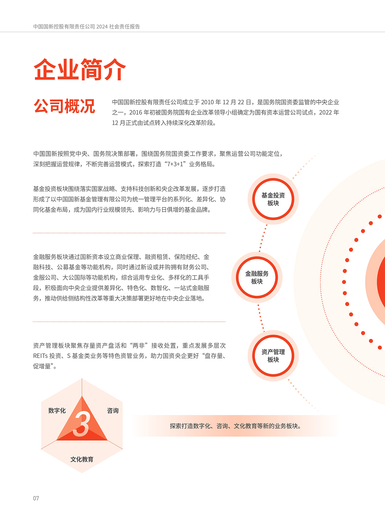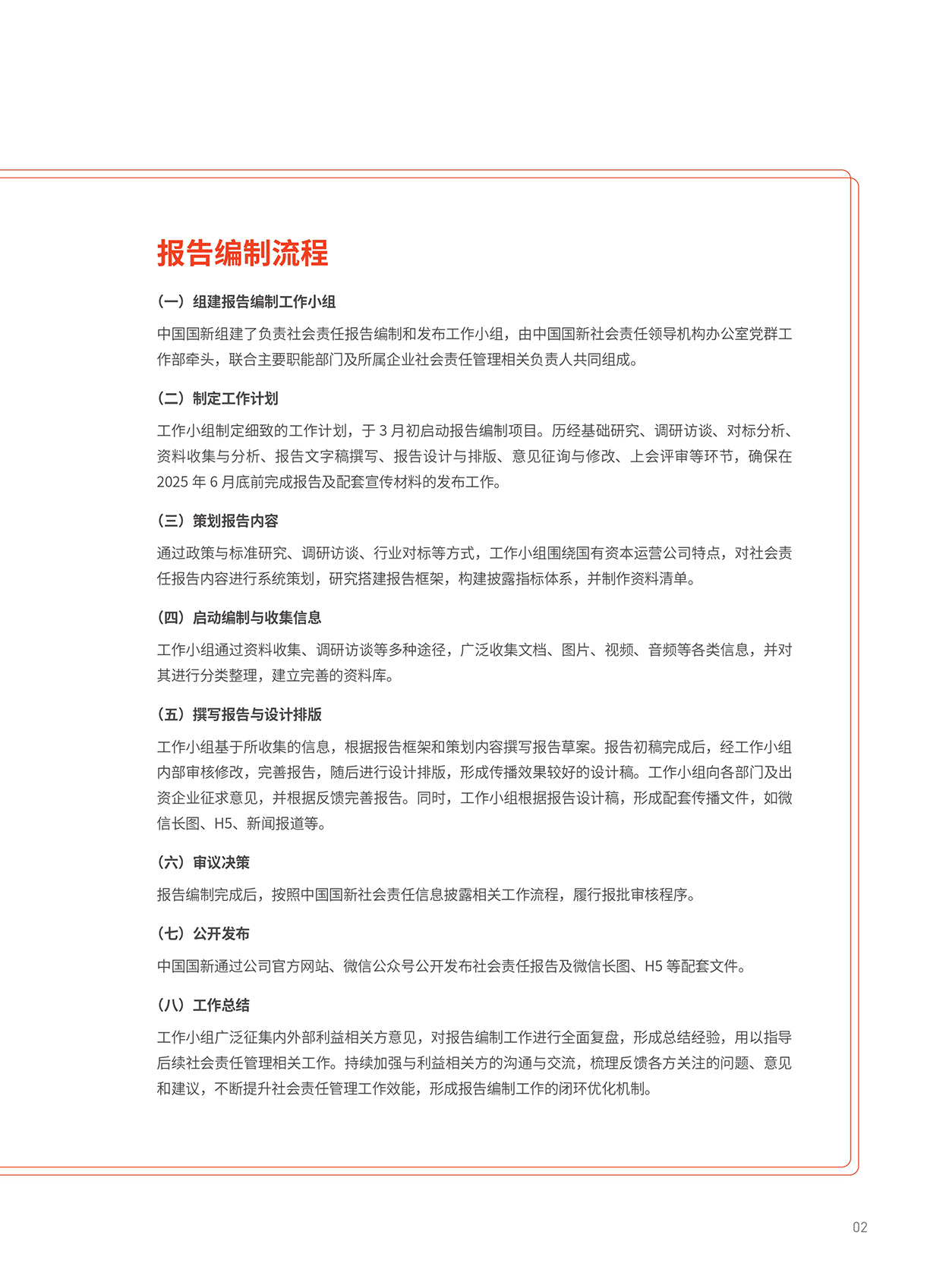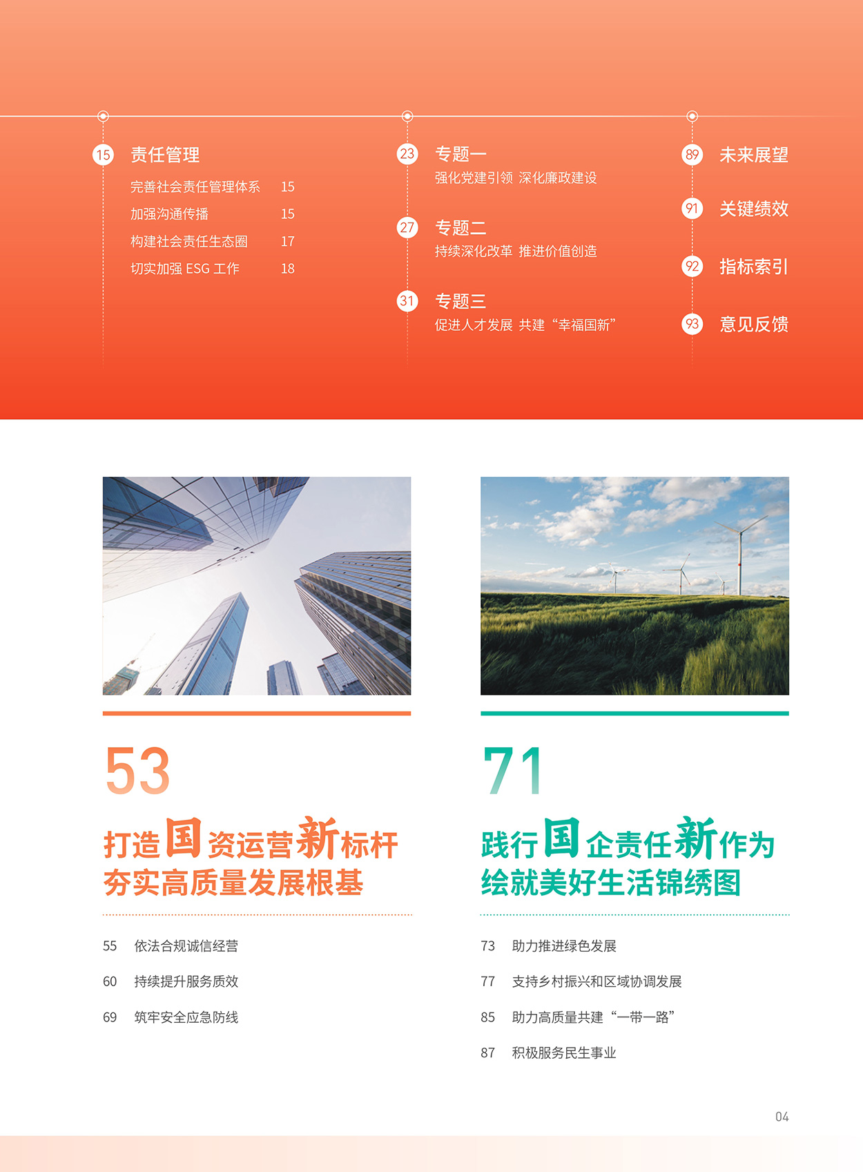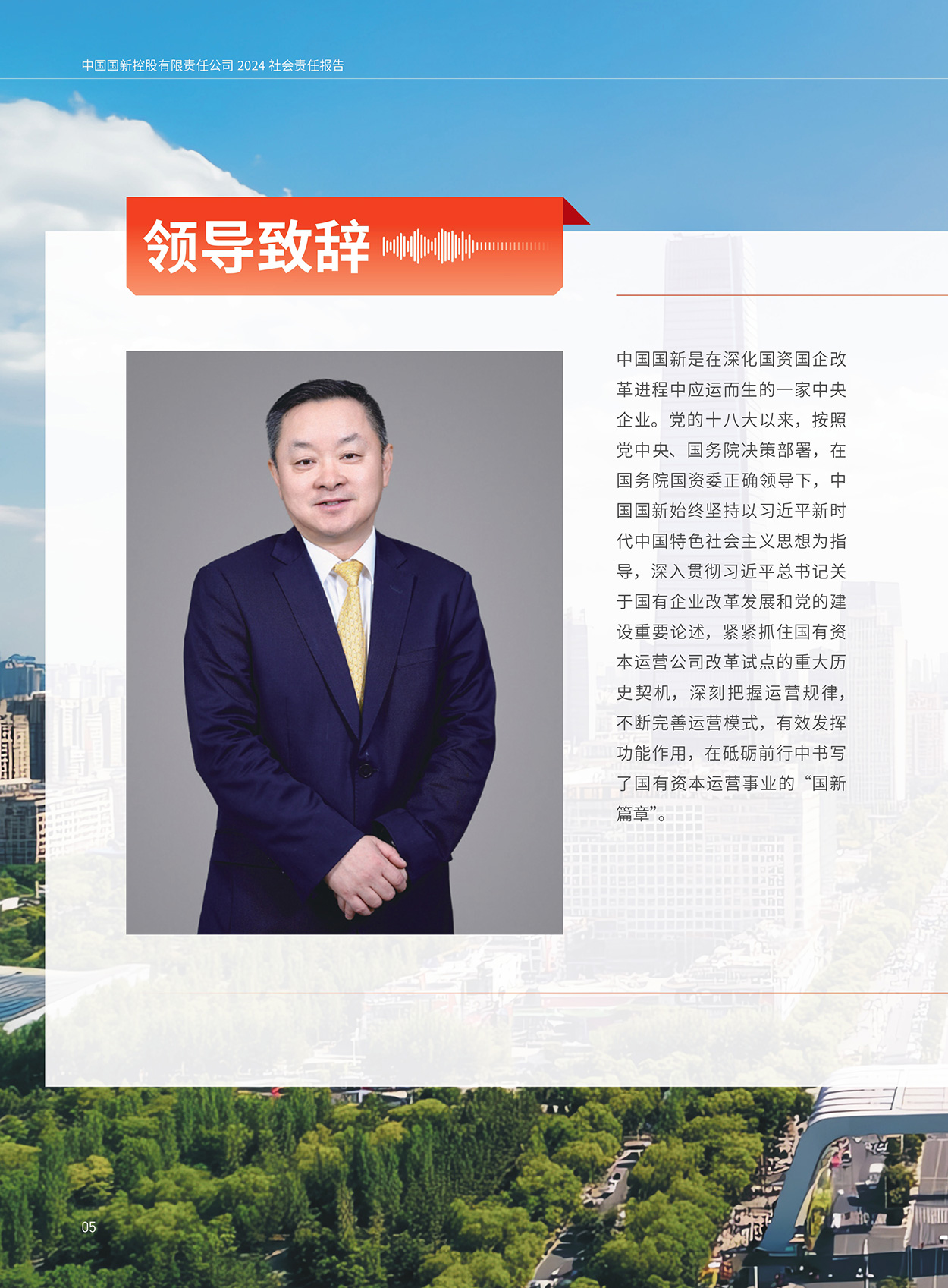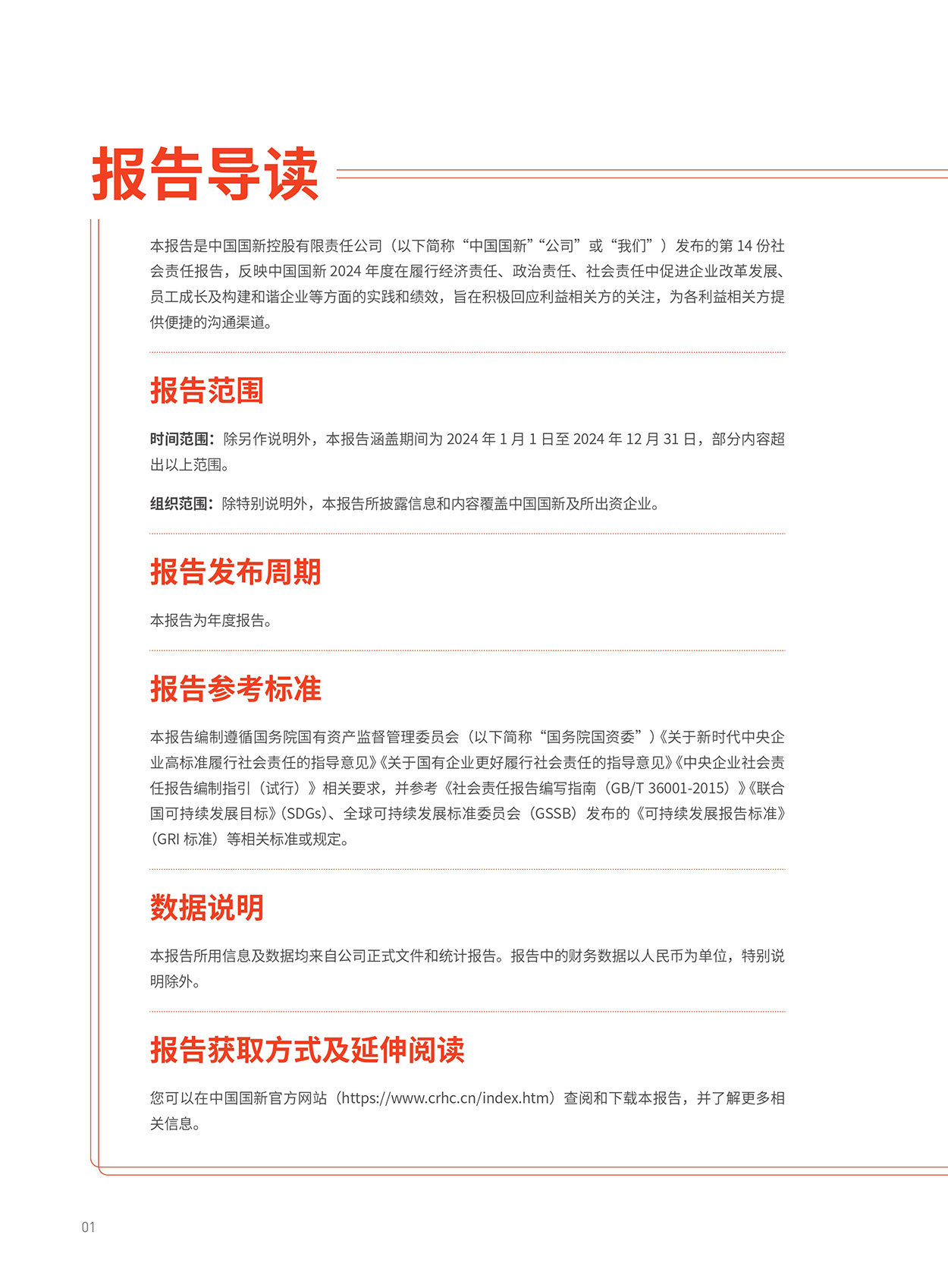 本報告是中國國新控股有限責任公司發布的第14份社會責任報告,反映中國國新2024年度在履行經濟責任、政治責任、社會責任中促進企業改革發展、員工成長及構建和諧企業等方面的實踐和績效,旨在積極回應利益相關方的關注,為各利益相關方提供便捷的溝通渠道。