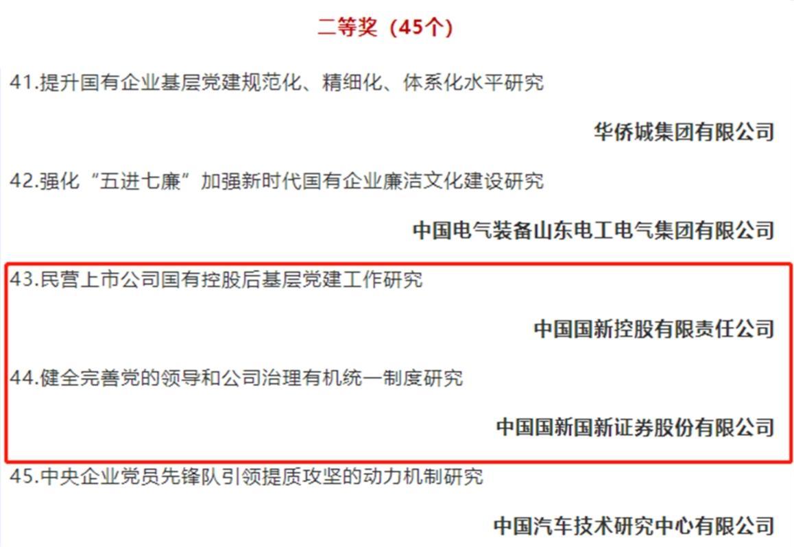 近日,中央企業黨建思想政治工作研究會發布2023年度優秀課題研究成果和優秀課題研究組織單位名單,其中,中國國新總部報送的《民營上市公司國有控股后基層黨建工作研究》和所屬國新證券報送的《健全完善黨的領導和公司治理有機統一制度研究》雙雙榮獲“年度優秀課題研究成果二等獎”。