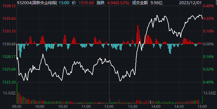 本次增持取得了積極效果,有效提振了央企上市公司市場表現及投資者信心。12月1日當天,上證指數開盤后低位運行,下午1點13分一度下跌0.62%。下午1點30分左右,中國證券報、財聯社等媒體關注到央企ETF增持動作,自主發布了“國有資本運營公司進場買入ETF”等相關報道,引起市場廣泛關注。在沒有其他重大利好消息的情況下,市場迎來反彈,上證指數最終收漲0.06%,較最低點反彈0.68個百分點。國新央企綜指收漲0.32%,較最低點反彈近1個百分點。國新央企科技引領指數、央企創新驅動指數分別收漲1.31%和0.46%。