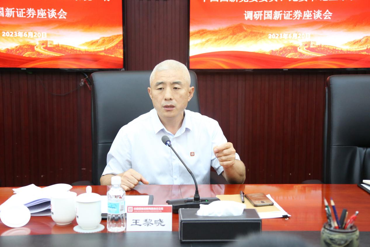 王黎曉聽取了國新證券黨委關于黨風廉政建設和反腐敗工作情況的匯報以及國新證券紀委工作匯報,對國新證券黨委全面從嚴治黨工作成效以及干部員工展現出的良好精神風貌給予了充分肯定。王黎曉要求,國新證券要切實提高政治站位,增強責任感緊迫感,盡快徹底肅清流毒,著力加快發展步伐,努力實現提級進位。一要持續深入開展主題教育,學深悟透習近平新時代中國特色社會主義思想,真正做到入腦入心、篤信篤行,不斷增進對黨的創新理論的政治認同、思想認同、理論認同、情感認同,自覺用習近平新時代中國特色社會主義思想指導各項工作。二要深刻認識當前黨風廉政建設和反腐敗斗爭面臨的嚴峻復雜形勢,自覺抵制“國企特殊論”“金融例外論”,結合國新證券實際,將黨風廉政建設和反腐敗工作進一步抓好抓實。要深入學習領會中國國新黨委書記、董事長周渝波在中國國新黨委主題教育第三期讀書班總結講話精神,嚴格對照講話中指出的13個方面作風問題,全面檢視,認真整改,切實加強作風建設。三要持續完善全面從嚴治黨責任落實機制,嚴格落實黨委主體責任,黨委書記履行好第一責任人責任,黨委班子其他成員履行好“一崗雙責”,堅持糾“四風”樹新風,一體推進“三不腐”,支持紀委強化監督執紀問責,加強對紀檢干部的監督教育管理。國新證券各部門各單位及全體黨員干部要切實將主題教育激發出來的學習、工作熱情轉化為自覺行動、自我驅動的強大動力,以昂揚向上的姿態和奮發有為的精神,推動國新證券各項工作邁上新臺階。
