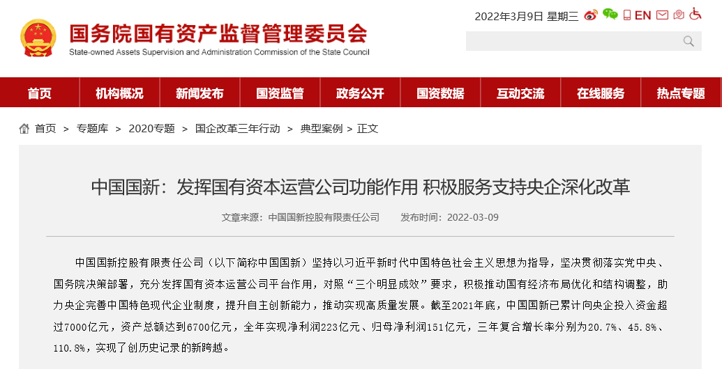 3月9日,國資委網站刊發中國國新落實國企改革三年行動典型案例文章《中國國新:發揮國有資本運營公司功能作用 積極服務支持央企深化改革 》。為您全文分享如下。