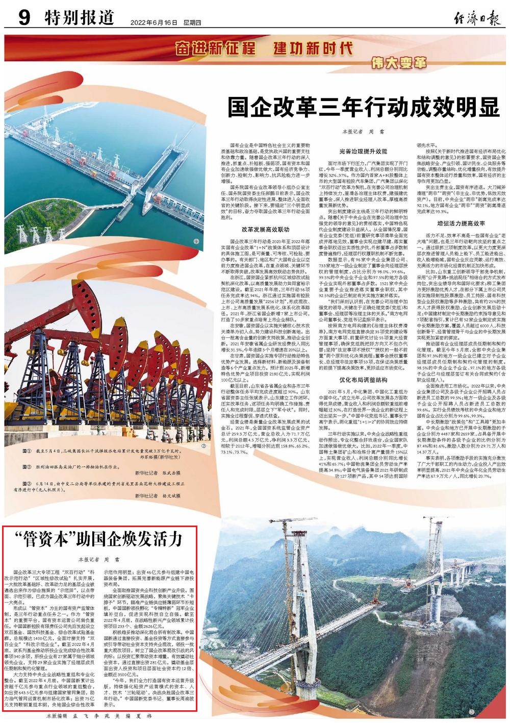 2022年6月16日出刊的《經濟日報》在“奮進新征程 建功新時代·偉大變革”推出特別報道《國企改革三年行動成效明顯》,深入報道了國企改革三年行動取得的決定性進展和重要成效。報道同時配發《“管資本”助國企煥發活力》一文,專門報道了中國國新如何聚焦改革三年行動,強化運營公司功能作用,服務央企改革發展。現將全文分享如下: