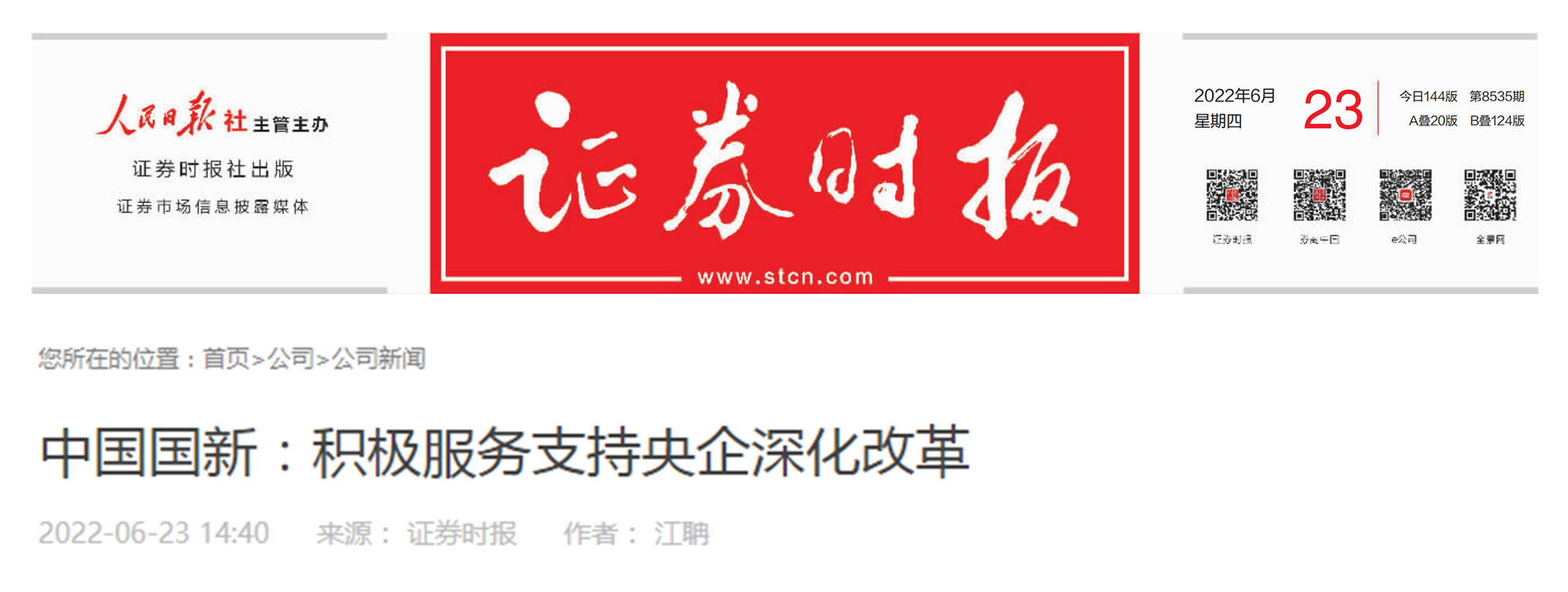 6月23日,《證券時報》聚焦中國國新在改革三年行動中的工作成效,刊載《中國國新:積極服務支持央企深化改革》一文。現將原文內容分享如下: