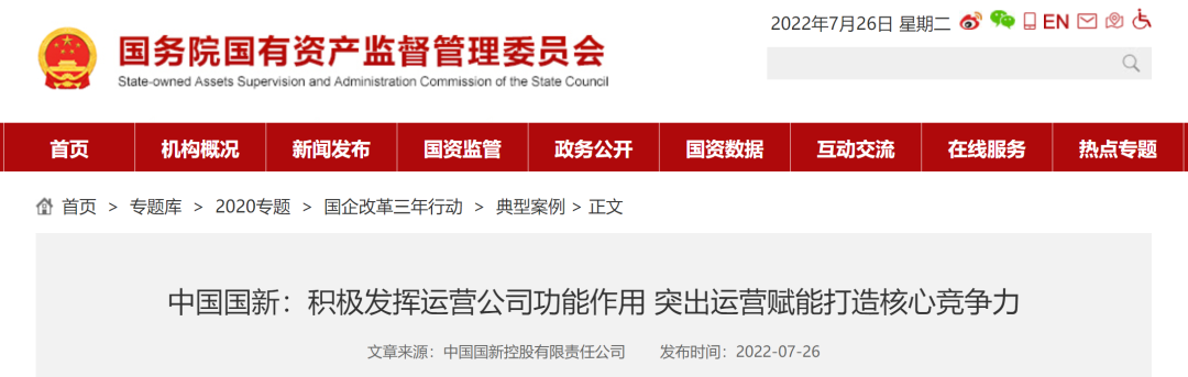 7月26日,國資委網站刊載《中國國新:積極發揮運營公司功能作用 突出運營賦能打造核心競爭力》一文,深入報道中國國新充分運用國有資本運營公司市場化專業平臺作用,探索踐行“運營賦能”理念,突出資本賦能、生態賦能、改革賦能,助力國資央企改革發展不斷向縱深推進。現將全文分享如下:
