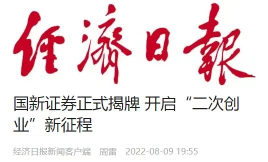 8月8日下午,國新證券股份有限公司揭牌儀式暨全體員工大會在京舉行。《經濟日報》聚焦國新證券“二次創業”,8月9日刊載《國新證券正式揭牌 開啟“二次創業”新征程》一文,現將全文分享如下:
