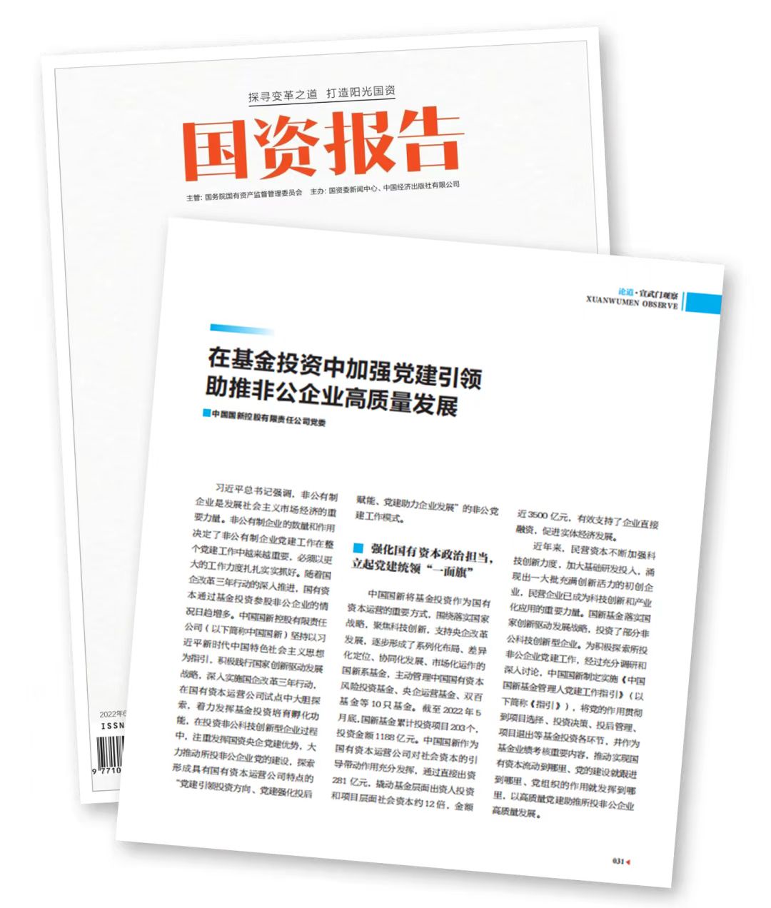 8月15日,《國資報告》刊載《中國國新:在基金投資中加強黨建引領 助推非公企業高質量發展》一文,深入報道了中國國新“黨建引領投資方向、黨建強化投后賦能、黨建助力企業發展”的非公黨建工作模式。現將全文分享如下: