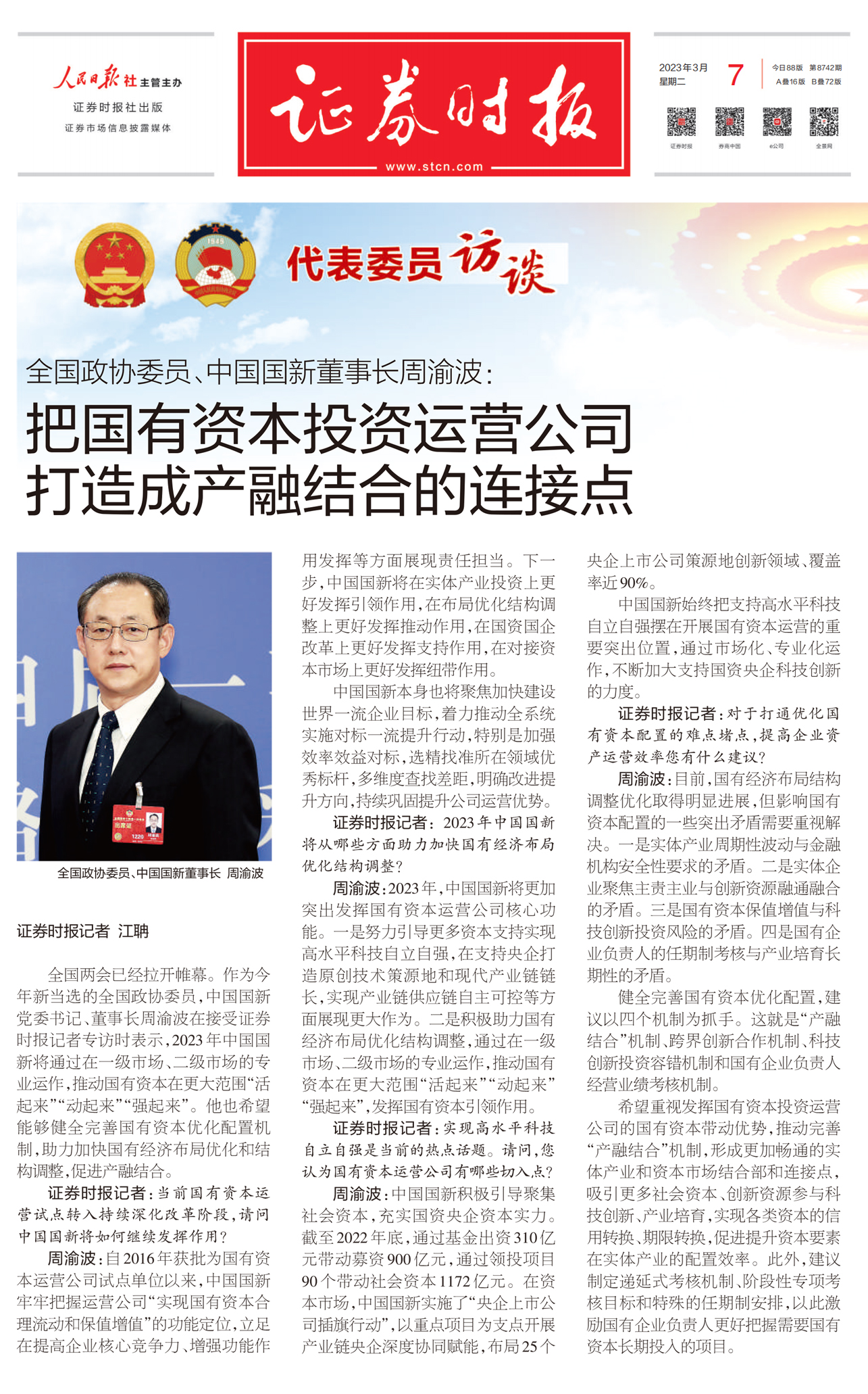 3月7日,證券時報聚焦兩會聲音,圍繞健全完善國有資本優化配置機制,助力加快國有經濟布局優化和結構調整,促進產融結合,采訪全國政協委員,中國國新黨委書記、董事長周渝波,并刊發《把國有資本投資運營公司打造成產融結合的連接點》一文。現將全文分享如下: