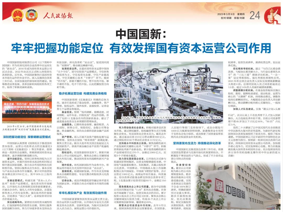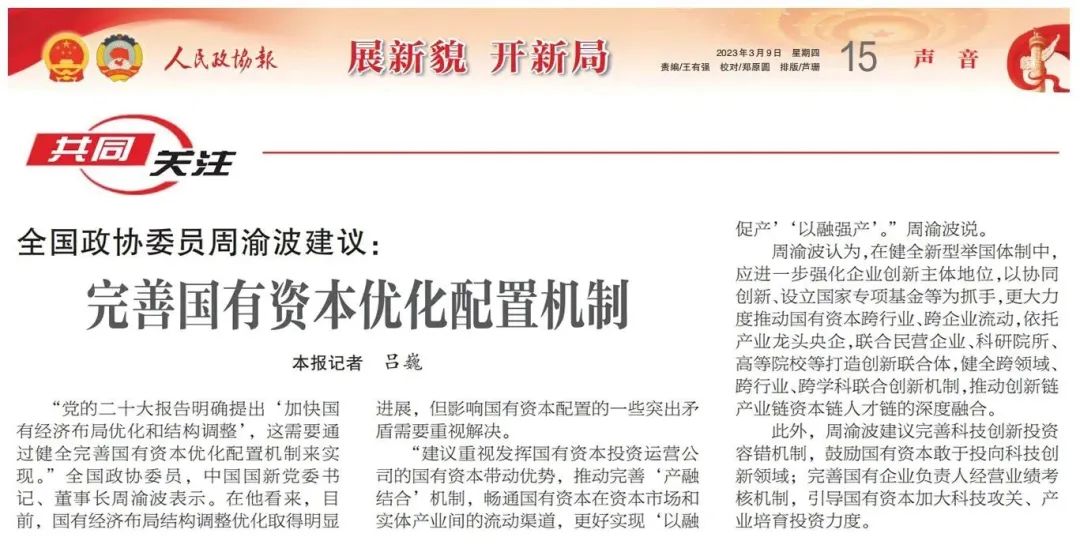 3月9日,《人民政協報》刊載《全國政協委員周渝波建議:完善國有資本優化配置機制》一文,關注全國政協委員,中國國新黨委書記、董事長周渝波在全國政協十四屆一次會議上的提案內容,并同步刊載《中國國新:牢牢把握功能定位 有效發揮國有資本運營公司作用》一文,宣傳報道中國國新改革發展和黨的建設工作成效。現將全文分享如下:
