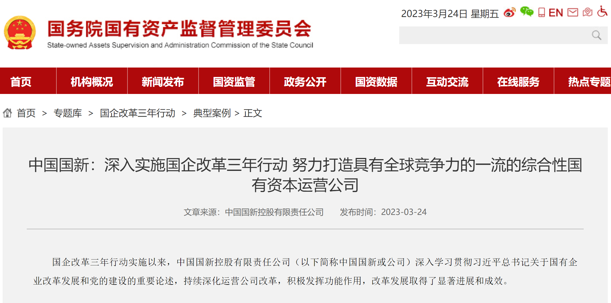 3月24日,國資委網站“國企改革三年行動”專欄刊載《中國國新:深入實施國企改革三年行動 努力打造具有全球競爭力的一流的綜合性國有資本運營公司》一文,從增強運營公司核心功能、完善中國特色現代企業制度、深化市場化機制、加強黨的領導黨的建設等四方面,報道中國國新持續深化運營公司改革,積極發揮功能作用。現將全文分享如下: