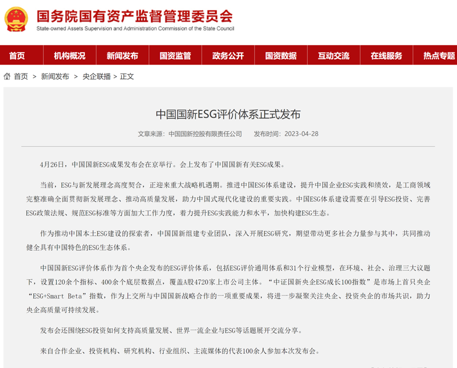 4月26日下午,“中國國新ESG成果發布會”在京舉行。4月28日,國資委網站聚焦“中證國新央企ESG成長100指數”發布,推進中國ESG體系建設,助力推動健全具有中國特色的ESG生態體系。現為您全文分享如下: