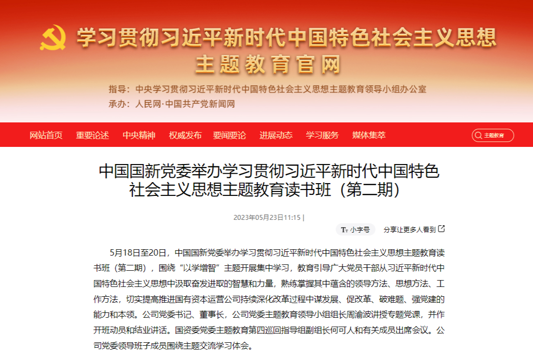 5月23日,學習貫徹習近平新時代中國特色社會主義思想主題教育官方網站報道中國國新黨委舉辦主題教育讀書班(第二期)相關內容。中國國新黨委舉辦的第二期主題教育讀書班,以“以學增智”為主題,為期三天。此次讀書班通過開展集中學習,旨在教育廣大黨員干部從習近平新時代中國特色社會主義思想中汲取智慧和力量。現全文分享如下: