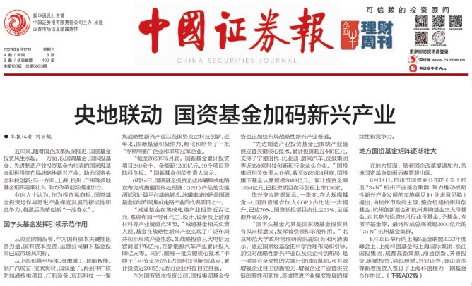 6月17日,中國證券報頭版刊載《央地聯動 國資基金加碼新興產業》一文,報道國家級基金、地方國資基金近年來積極投資布局戰略性新興產業。其中指出,國新基金聚焦戰略性新興產業以及國資央企科技創新,積極作為,孵化和培育了一批“專精特新”企業和單項冠軍企業。現全文分享如下: