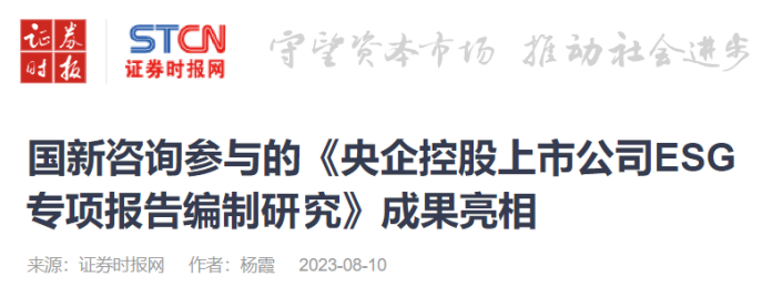 8月10日,證券時報聚焦國資委ESG相關課題《央企控股上市公司ESG專項報告編制研究》,報道國新咨詢全程參與課題研究并助力相關成果落地應用。現全文分享如下: