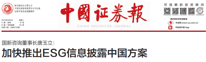 9月5日,中國證券報專訪國新咨詢董事長唐玉立,刊載《加快推出ESG信息披露中國方案》一文,文章指出國新咨詢將通過《央企控股上市公司ESG專項報告編制研究》推動與國際ESG信息披露標準的對標與整合應用,加快推出ESG信息披露中國方案。現全文分享如下: