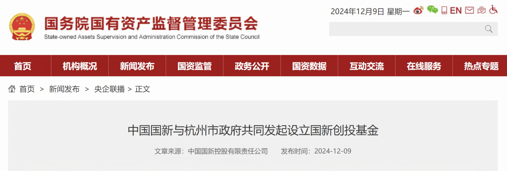 12月9日,國務院國資委網站發布《中國國新與杭州市政府共同發起設立國新創投基金》,聚焦中國國新與杭州市政府共同發起設立的國新創投基金,報道國新創投基金以科創企業為投資標的,為科技強國建設和新質生產力培育貢獻力量。現全文分享如下: