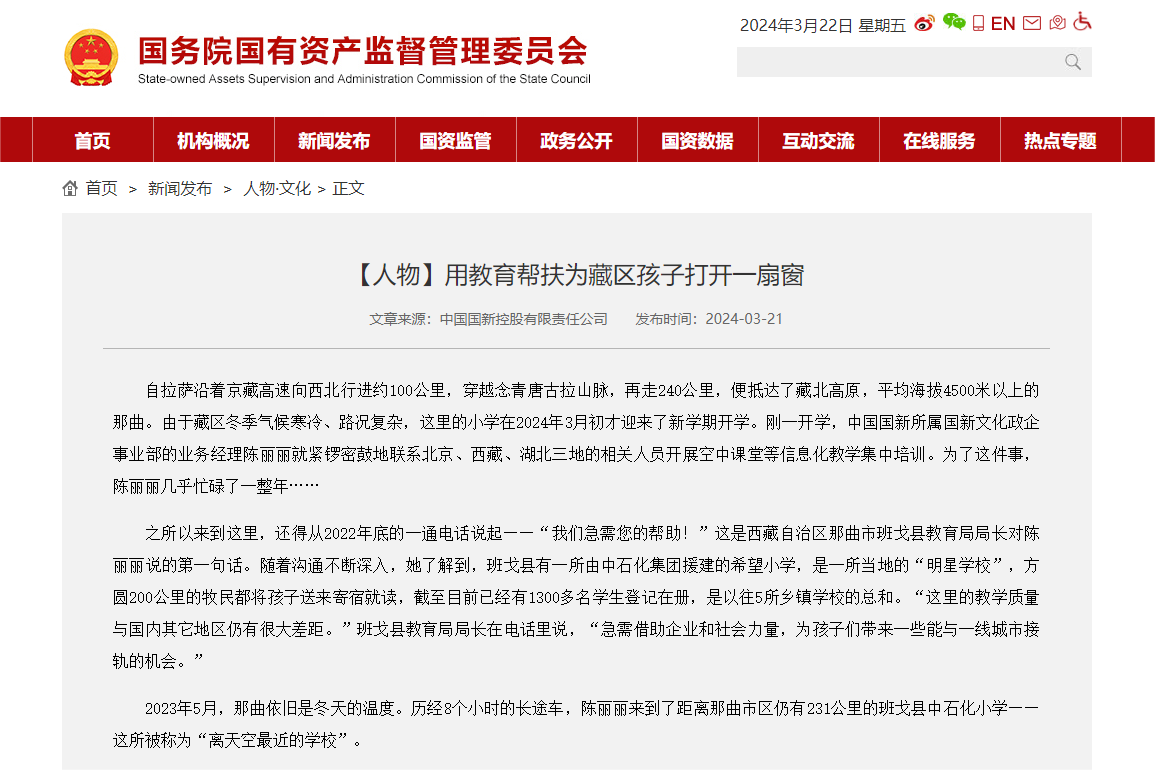 3月21日,國務院國資委網(wǎng)站“人物·文化”專欄刊載《用教育幫扶為藏區(qū)孩子打開一扇窗》,報道中國國新所屬國新文化員工陳麗麗深入西藏自治區(qū)班戈縣,積極推動班戈縣中石化小學智慧課堂建設,開展教育幫扶的故事。現(xiàn)全文分享如下: