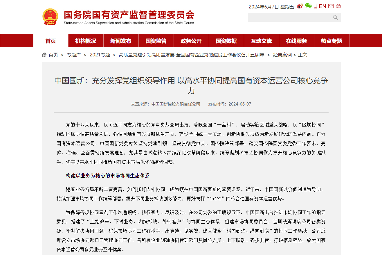 6月7日,國務院國資委網站發(fā)布《中國國新:充分發(fā)揮黨組織領導作用 以高水平協(xié)同提高國有資本運營公司核心競爭力》,報道中國國新黨委堅持黨建引領,構建以業(yè)務為核心的市場協(xié)同生態(tài)體系,以“高水平協(xié)同”提高企業(yè)核心競爭力,加快建設世界一流資本運營公司。現(xiàn)全文分享如下: