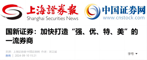 今天,推出相關(guān)報(bào)道第5篇:《上海證券報(bào)》中國證券網(wǎng)9月10日刊發(fā)的《國新證券:加快打造“強(qiáng)、優(yōu)、特、美”的一流券商》。